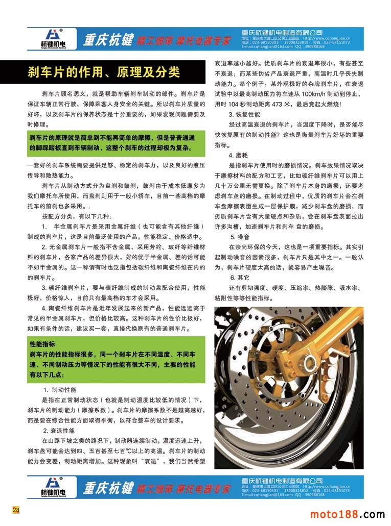 繼2013年12期開始全彩色出刊,再加上每期一個專題的配件子行業(yè)的廣角介紹,我們積累了一定的經(jīng)驗,也有信心做好全部子行業(yè)的介紹。目前摩托車分為六大部件,每一大部件又細分為十幾二十幾不少的子部件,和摩托車有關(guān)的附件也可另算為一大類,因而我們要想全方位做完各個子行業(yè),就需要有幾年的時間。經(jīng)過這三期的編排,使我們進一步加深對摩托車配件行業(yè)的了解,這一期剎車蹄塊我們本來認為這個子行業(yè)報道的題材和內(nèi)容有限,但我們把資料匯總以后,原來這些行業(yè)也別有洞天,后來我們不得不壓縮了題材,精選了內(nèi)容,還是排了十幾張紙;再加上我們又涉及到三輪摩托車、電動摩托車,沒想到就連小型通機也要用蹄塊制動。