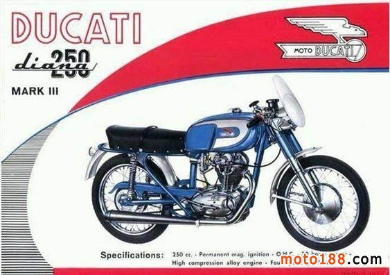 250diana mark 3 生產(chǎn)年份1966 引擎為單缸風(fēng)冷四沖程SOHC;排量249;壓縮比8.0:1;最大馬力19.5hp7750rpm;5檔位;整車(chē)質(zhì)量120公斤;油箱17升