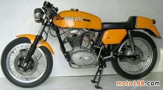 350desmo 生產(chǎn)年份1970-1974 引擎為單缸風(fēng)冷四沖程SOHC;排量340;壓縮比10.0:1;最大馬力34hp8500rpm;5檔位;前剎車單282毫米盤式;后剎車160毫米鼓式;整車質(zhì)量148公斤;油箱13升