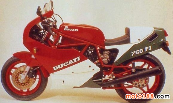 750 F1 生產(chǎn)年份1985-1988 引擎為空氣冷卻四沖程V型雙缸;排量748;壓縮比9.3:1;最大馬力76hp9000rpm;5檔位;整車質(zhì)量175公斤;油箱18升