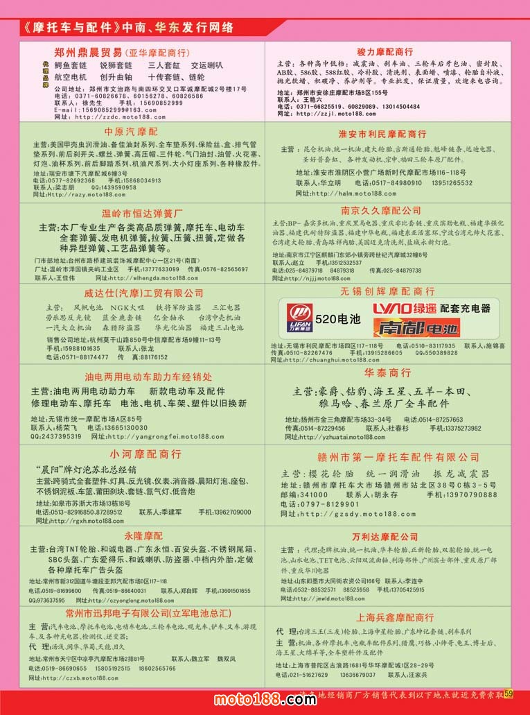 除了《西北市場(chǎng)指南》在會(huì)上投放,還有《會(huì)刊》由大會(huì)組委會(huì)分發(fā)給所有參會(huì)人員和企業(yè),我們的四月期全彩雜志以及第七期《摩托車(chē)與配件外貿(mào)報(bào)》。我們的展位在1142,歡迎在會(huì)上領(lǐng)取,指南需要名片交換,其余隨到隨取。