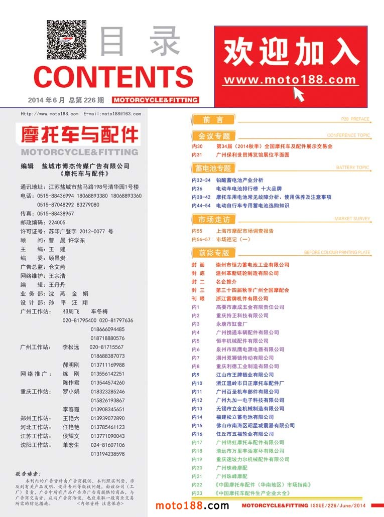 這一期是電池的專題,是摩托車和電動車都必須要用的重要部件。我們從龐雜的資料中精選了十四頁內容,其中有一篇是由企業(yè)提供的稿件。我們歡迎企業(yè)能踴躍投稿,將你們的技術和經(jīng)驗與行業(yè)共同分享,提升行業(yè)整體素質,同時也可以通過我們這個平臺來提升企業(yè)的知譽度。