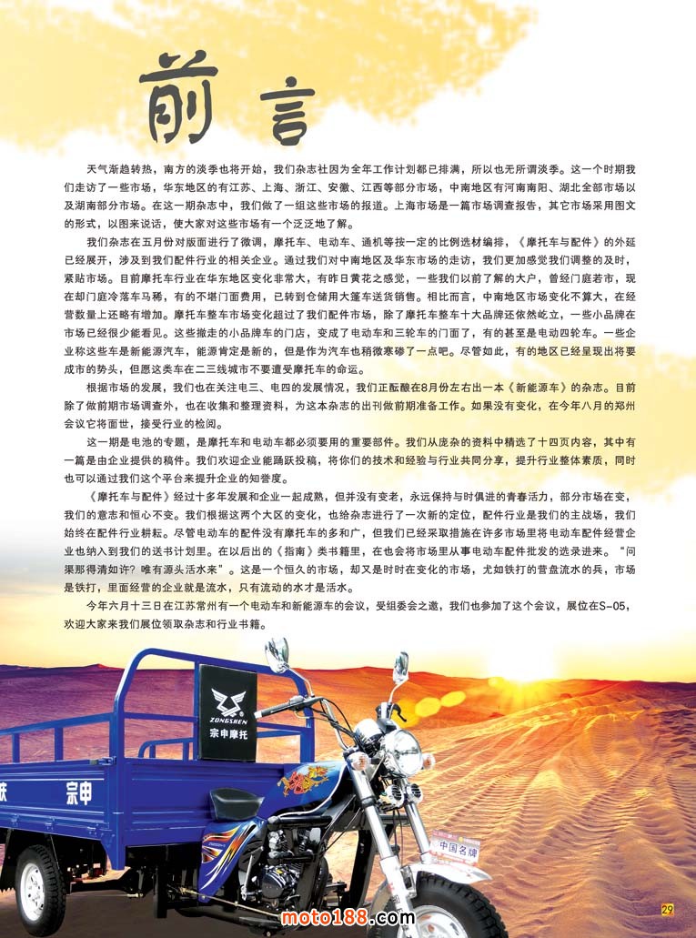 我們雜志在五月份對版面進行了微調,摩托車、電動車、通機等按一定的比例選材編排《摩托車與配件》的外延已經展開,涉及到我們配件行業(yè)的相關企業(yè)。通過我們對中南地區(qū)及華東市場的走訪,我們更加感覺我們調整的及時,緊貼市場。目前摩托車行業(yè)在華東地區(qū)變化非常大,有昨日黃花之感覺,一些我們以前了解的大戶,曾經門庭若市,現在卻門庭冷落車馬稀,有的不堪門面費用,已轉到倉儲用大篷車送貨銷售。相比而言,中南地區(qū)市場變化不算大,在經營數量上還略有增加。摩托車整車市場變化超過了我們配件市場,除了摩托車整車十大品牌還依然屹立,一些小品牌在市場已經很少能看見。這些撤走的小品牌車的門店,變成了電動車和三輪車的門面了,有的甚至是電動四輪車。一些企業(yè)稱這些車是新能源汽車,能源肯定是新的,但是作為汽車也稍微寒磣了一點吧。盡管如此,有的地區(qū)已經呈現出將要成市的勢頭,但愿這類車在二三線城市不要遭受摩托車的命運。