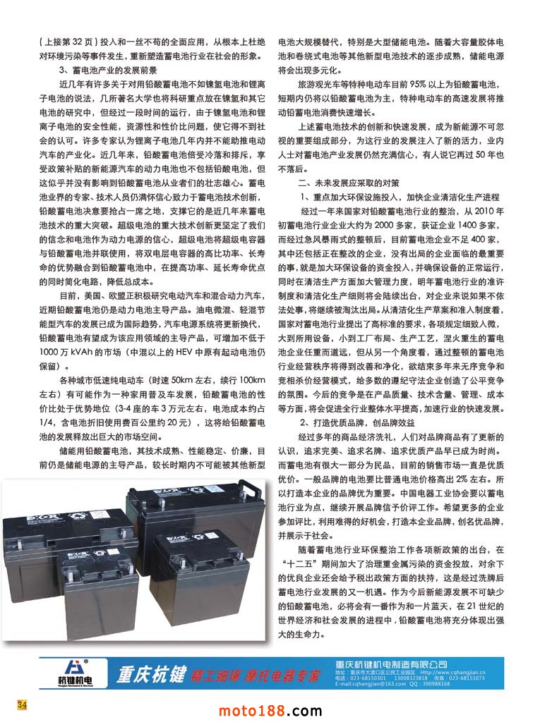 這一期是電池的專題,是摩托車和電動(dòng)車都必須要用的重要部件。我們從龐雜的資料中精選了十四頁內(nèi)容,其中有一篇是由企業(yè)提供的稿件。我們歡迎企業(yè)能踴躍投稿,將你們的技術(shù)和經(jīng)驗(yàn)與行業(yè)共同分享,提升行業(yè)整體素質(zhì),同時(shí)也可以通過我們這個(gè)平臺(tái)來提升企業(yè)的知譽(yù)度。