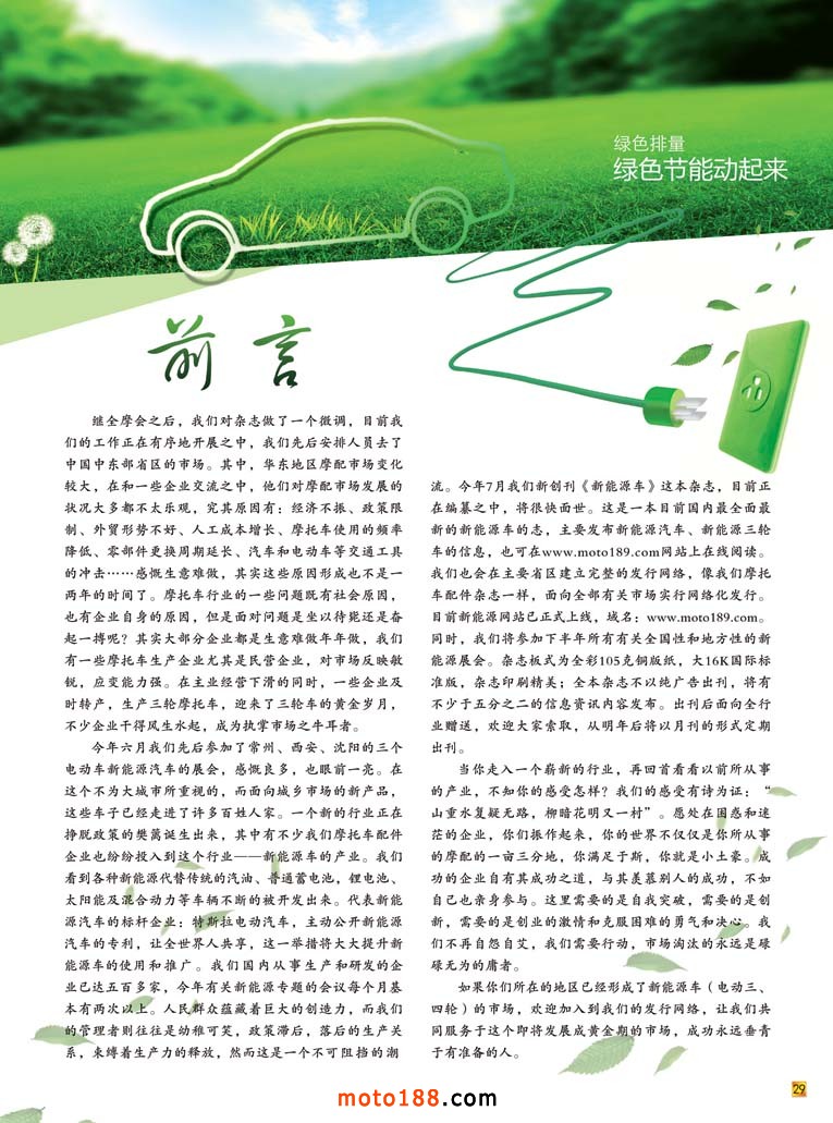 今年六月我們先后參加了常州、西安、沈陽的三個電動車新能源汽車的展會,感慨良多,也眼前一亮。在這個不為大城市所重視的,而面向城鄉(xiāng)市場的新產品,這些車子已經走進了許多百姓人家。一個新的行業(yè)正在掙脫政策的樊籬誕生出來,其中有不少我們摩托車配件企業(yè)也紛紛投入到這個行業(yè)——新能源車的產業(yè)。我們看到各種新能源代替?zhèn)鹘y(tǒng)的汽油、普通蓄電池,鋰電池、太陽能及混合動力等車輛不斷的被開發(fā)出來。代表新能源汽車的標桿企業(yè):特斯拉電動汽車,主動公開新能源汽車的專利,讓全世界人共享,這一舉措將大大提升新能源車的使用和推廣。我們國內從事生產和研發(fā)的企業(yè)已達五百多家,今年有關新能源專題的會議每個月基本有兩次以上。人民群眾蘊藏著巨大的創(chuàng)造力,而我們的管理者則往往是幼稚可笑,政策滯后,落后的生產關系,束縛著生產力的釋放,然而這是一個不可阻擋的潮流。今年7月我們新創(chuàng)刊《新能源車》這本雜志,目前正在編纂之中,將很快面世。這是一本目前國內最全面最新的新能源車的志,主要發(fā)布新能源汽車、新能源三輪車的信息,也可在www.moto189.com網站上在線閱讀。我們也會在主要省區(qū)建立完整的發(fā)行網絡,像我們摩托車配件雜志一樣,面向全部有關市場實行網絡化發(fā)行。目前新能源網站已正式上線,域名:www.moto189.com。同時,我們將參加下半年所有有關全國性和地方性的新能源展會。雜志板式為全彩105克銅版紙,大16K國際標準版,雜志印刷精美;全本雜志不以純廣告出刊,將有不少于五分之二的信息資訊內容發(fā)布。出刊后面向全行業(yè)贈送,歡迎大家索取,從明年后將以月刊的形式定期出刊。