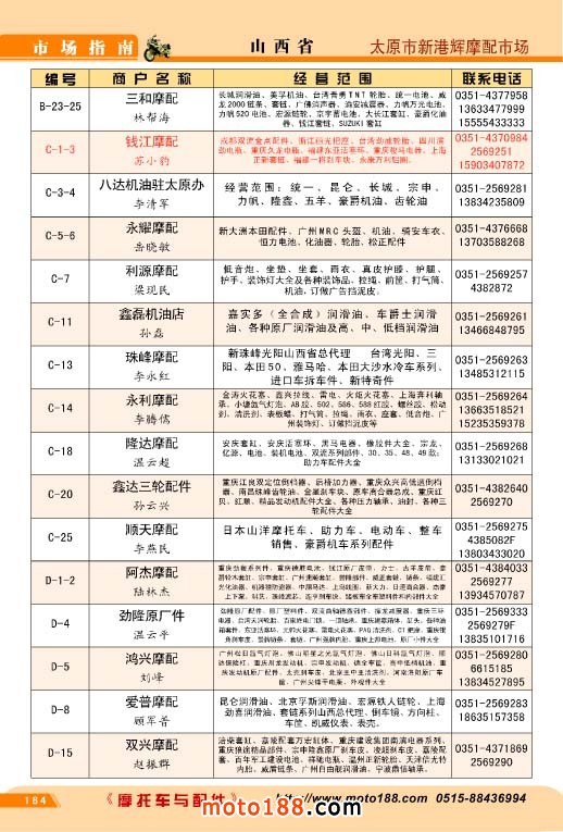歷時半年,橫跨十三省市的《北方市場指南》今天終于成書,奉獻給行業(yè)企業(yè),這本書是我們《中國摩托車配件市場指南》的第三個分冊,也是工作量和難度最大的一本書,為了資料的準確,我們雜志社全體內(nèi)部工作人員,在炎熱的夏季里,孜孜不倦地工作,先后冒著酷暑兵分三 路去西北、華北、東北的省份,由于夏季暑運高峰,交通也十分不便,有時為了趕路,甚至乘了三十多個小時無空調(diào)的大巴車。今天看到這本混合我們汗水和心血的《北方市場指南》我們感覺這份果實更加不同尋常,彌加珍貴。