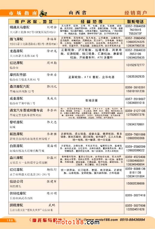目前本系列書籍已成功出版了三個(gè)系列,由于我們的真心付出,市場的反響也越來越好,本來我們計(jì)劃在全國摩配會前截稿,由于廣告突破了我們的計(jì)劃,我們提前一個(gè)月出版,本書 的信息量也比以往大,廣告量如不控制將會爆發(fā)性增長,書太厚不方便大家的使用,因而我們 毅然提前停止了廣告的征集。