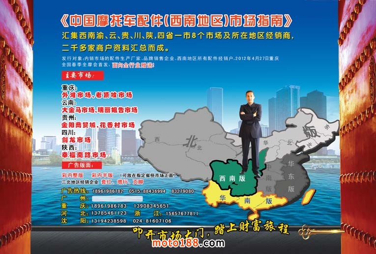 2012年春,行業(yè)最具影響力的“春季全摩會(huì)”4月27日在重慶召開,我們將在特殊的時(shí)間,特 殊的地域,特殊的市場(chǎng),推出獨(dú)具特色的《中國(guó)摩托車配件·西南市場(chǎng)指南》,為您的經(jīng)營(yíng)提供方向,為您的騰飛插上翅膀。