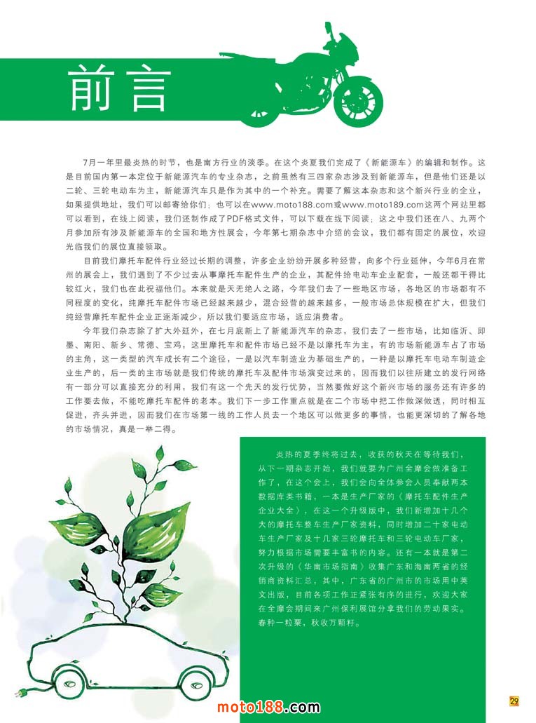 炎熱的夏季終將過去,收獲的秋天在等待我們,從下一期雜志開始,我們就要為廣州全摩會做準備工作了,在這個會上,我們會向全體參會人員奉獻兩本數(shù)據(jù)庫類書籍,一本是生產廠家的《摩托車配件生產企業(yè)大全》,在這一個升級版中,我們新增加十幾個大的摩托車整車生產廠家資料,同時增加二十家電動車生產廠家及十幾家三輪摩托車和三輪電動車廠家,努力根據(jù)市場需要豐富書的內容。還有一本就是第二次升級的《華南市場指南》收集廣東和海南兩省的經銷商資料匯總,其中,廣東省的廣州市的市場用中英文出版,目前各項工作正緊張有序的進行,歡迎大家在全摩會期間來廣州保利展館分享我們的勞動果實。春種一粒粟,秋收萬顆籽。