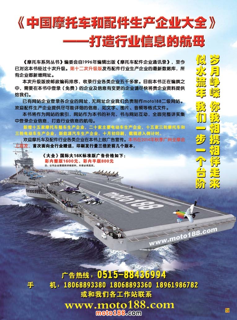 炎熱的夏季終將過去,收獲的秋天在等待我們,從下一期雜志開始,我們就要為廣州全摩會做準備工作了,在這個會上,我們會向全體參會人員奉獻兩本數(shù)據(jù)庫類書籍,一本是生產(chǎn)廠家的《摩托車配件生產(chǎn)企業(yè)大全》,在這一個升級版中,我們新增加十幾個大的摩托車整車生產(chǎn)廠家資料,同時增加二十家電動車生產(chǎn)廠家及十幾家三輪摩托車和三輪電動車廠家,努力根據(jù)市場需要豐富書的內容。還有一本就是第二次升級的《華南市場指南》收集廣東和海南兩省的經(jīng)銷商資料匯總,其中,廣東省的廣州市的市場用中英文出版,目前各項工作正緊張有序的進行,歡迎大家在全摩會期間來廣州保利展館分享我們的勞動果實。春種一粒粟,秋收萬顆籽。