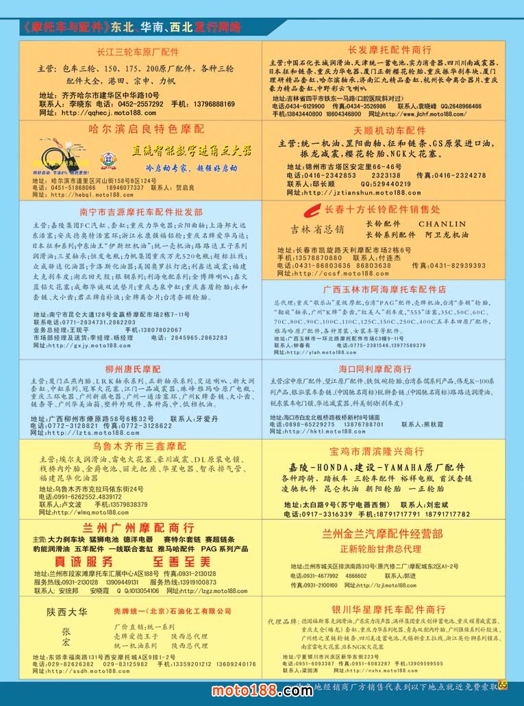炎熱的夏季終將過去,收獲的秋天在等待我們,從下一期雜志開始,我們就要為廣州全摩會做準(zhǔn)備工作了,在這個會上,我們會向全體參會人員奉獻兩本數(shù)據(jù)庫類書籍,一本是生產(chǎn)廠家的《摩托車配件生產(chǎn)企業(yè)大全》,在這一個升級版中,我們新增加十幾個大的摩托車整車生產(chǎn)廠家資料,同時增加二十家電動車生產(chǎn)廠家及十幾家三輪摩托車和三輪電動車廠家,努力根據(jù)市場需要豐富書的內(nèi)容。還有一本就是第二次升級的《華南市場指南》收集廣東和海南兩省的經(jīng)銷商資料匯總,其中,廣東省的廣州市的市場用中英文出版,目前各項工作正緊張有序的進行,歡迎大家在全摩會期間來廣州保利展館分享我們的勞動果實。春種一粒粟,秋收萬顆籽。
