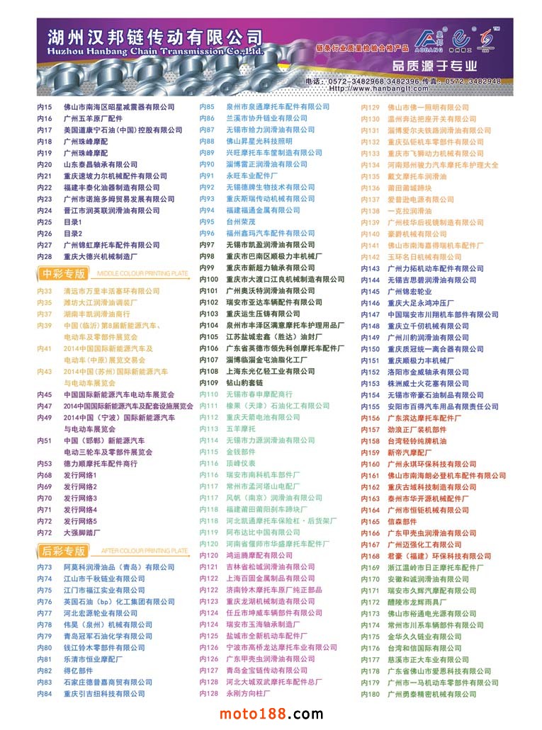 全摩會(huì)還有2個(gè)多月就在廣州召開了,這次會(huì)上我們將奉獻(xiàn)給大家的是第12次升級(jí)的《中國(guó)摩托車配件生產(chǎn)企業(yè)大全》在這本書中。我們新增了目錄銷售排名前10-20名的摩托車整車生產(chǎn)企業(yè),二輪電動(dòng)車生產(chǎn)企業(yè)、燃油和電動(dòng)三輪生產(chǎn)企業(yè)的名錄,方便大家在增加經(jīng)營(yíng)的同時(shí),有所選擇和參考?!度A南市場(chǎng)指南》含廣東和海南兩省市場(chǎng)經(jīng)銷商戶的資料,其中的廣州白云區(qū)羅沖圍一帶的市場(chǎng)是用中英文雙語(yǔ)編排,方便外商的閱讀;其余例行的十一期雜志和外貿(mào)報(bào)紙;另外還有部分華東和西北地區(qū)的新的市場(chǎng)指南(已經(jīng)在南京和西安會(huì)議首發(fā))。如果有興趣從事新能源汽車業(yè)務(wù)的企業(yè)也可拿到《新能源車》雜志。這是我們新出的雜志,具體可去moto189網(wǎng)站上瀏覽到全部的內(nèi)容,在此不多贅述。記住廣州再見(jiàn),帶上你的名片到1075展位領(lǐng)書去!