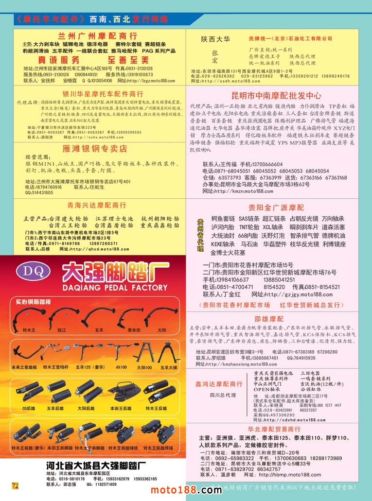 全摩會還有2個多月就在廣州召開了,這次會上我們將奉獻給大家的是第12次升級的《中國摩托車配件生產(chǎn)企業(yè)大全》在這本書中。我們新增了目錄銷售排名前10-20名的摩托車整車生產(chǎn)企業(yè),二輪電動車生產(chǎn)企業(yè)、燃油和電動三輪生產(chǎn)企業(yè)的名錄,方便大家在增加經(jīng)營的同時,有所選擇和參考?!度A南市場指南》含廣東和海南兩省市場經(jīng)銷商戶的資料,其中的廣州白云區(qū)羅沖圍一帶的市場是用中英文雙語編排,方便外商的閱讀;其余例行的十一期雜志和外貿(mào)報紙;另外還有部分華東和西北地區(qū)的新的市場指南(已經(jīng)在南京和西安會議首發(fā))。如果有興趣從事新能源汽車業(yè)務(wù)的企業(yè)也可拿到《新能源車》雜志。這是我們新出的雜志,具體可去moto189網(wǎng)站上瀏覽到全部的內(nèi)容,在此不多贅述。記住廣州再見,帶上你的名片到1075展位領(lǐng)書去!