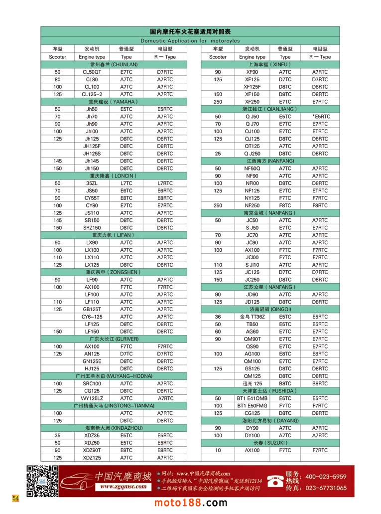 內(nèi)54 國(guó)內(nèi)摩托車火花塞適用對(duì)照表