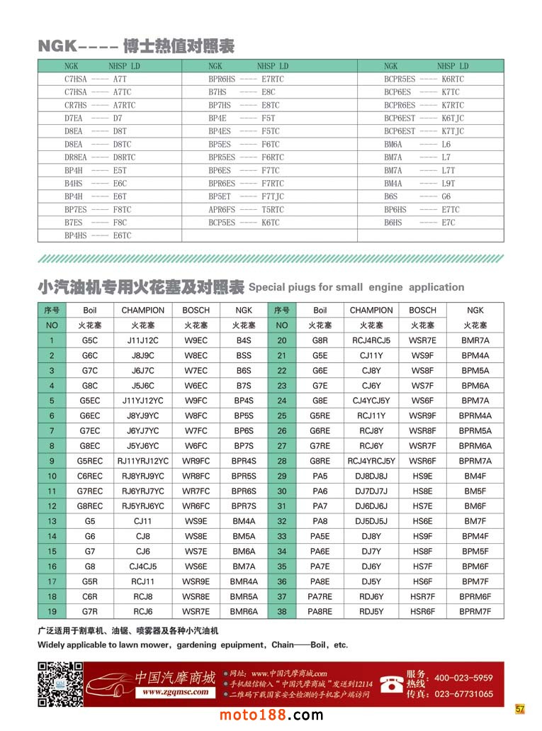 內(nèi)57 NGK----博士熱值對照表/小汽油機專用火花塞及對照表