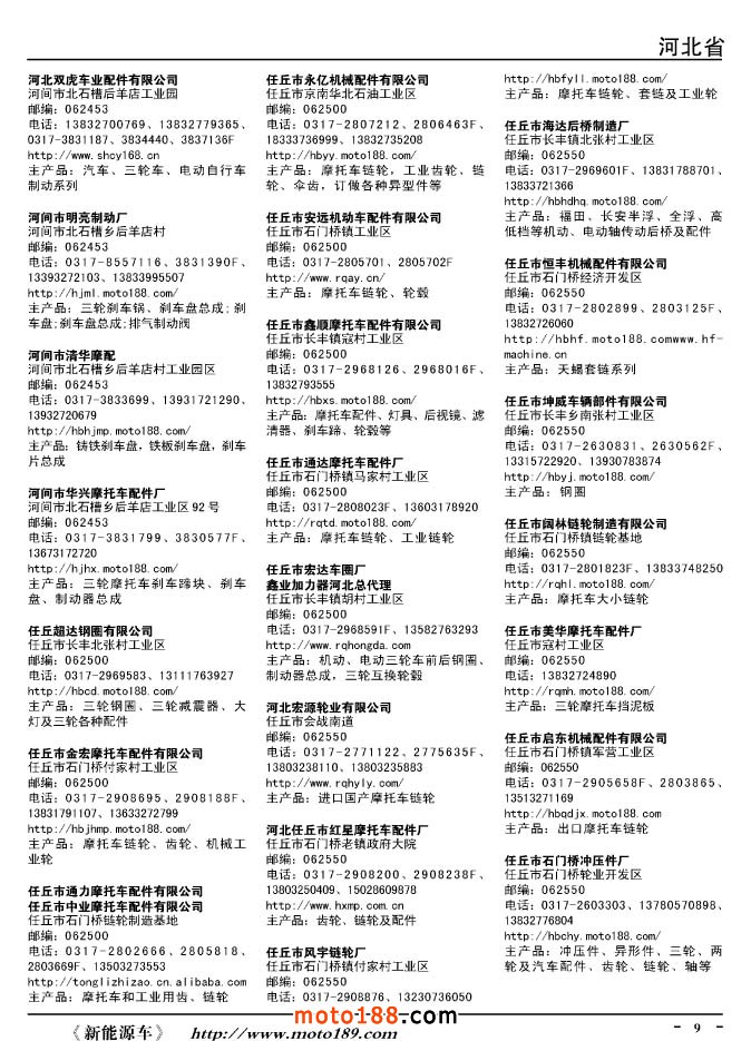 這兩年行業(yè)調(diào)整力度非常大,為了確保我們提供的信息準(zhǔn)確性,我們本著寧缺毋濫的原則,不去圖虛的數(shù)量。目前摩托車(chē)與配件行業(yè)的不少經(jīng)銷(xiāo)商是跨行業(yè)經(jīng)營(yíng)的,所以我們?cè)诒緯?shū)中增加了部分摩托車(chē)整車(chē)廠、電動(dòng)車(chē)生產(chǎn)廠、機(jī)動(dòng)三輪車(chē)制造廠。所選的這些企業(yè)都是這個(gè)行業(yè)具有影響力的品牌企業(yè),是為了大家在使用這本書(shū)時(shí),獲取相關(guān)的延伸產(chǎn)業(yè)更多的實(shí)用信息。