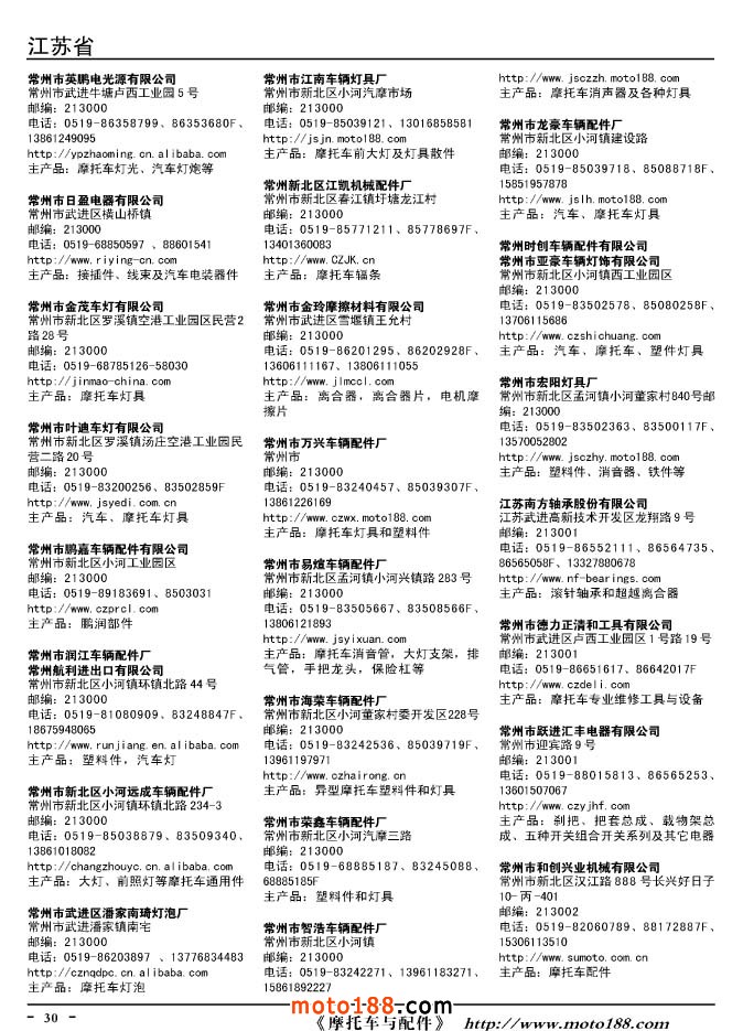 這兩年行業(yè)調(diào)整力度非常大,為了確保我們提供的信息準(zhǔn)確性,我們本著寧缺毋濫的原則,不去圖虛的數(shù)量。目前摩托車與配件行業(yè)的不少經(jīng)銷商是跨行業(yè)經(jīng)營的,所以我們在本書中增加了部分摩托車整車廠、電動車生產(chǎn)廠、機(jī)動三輪車制造廠。所選的這些企業(yè)都是這個行業(yè)具有影響力的品牌企業(yè),是為了大家在使用這本書時,獲取相關(guān)的延伸產(chǎn)業(yè)更多的實用信息。