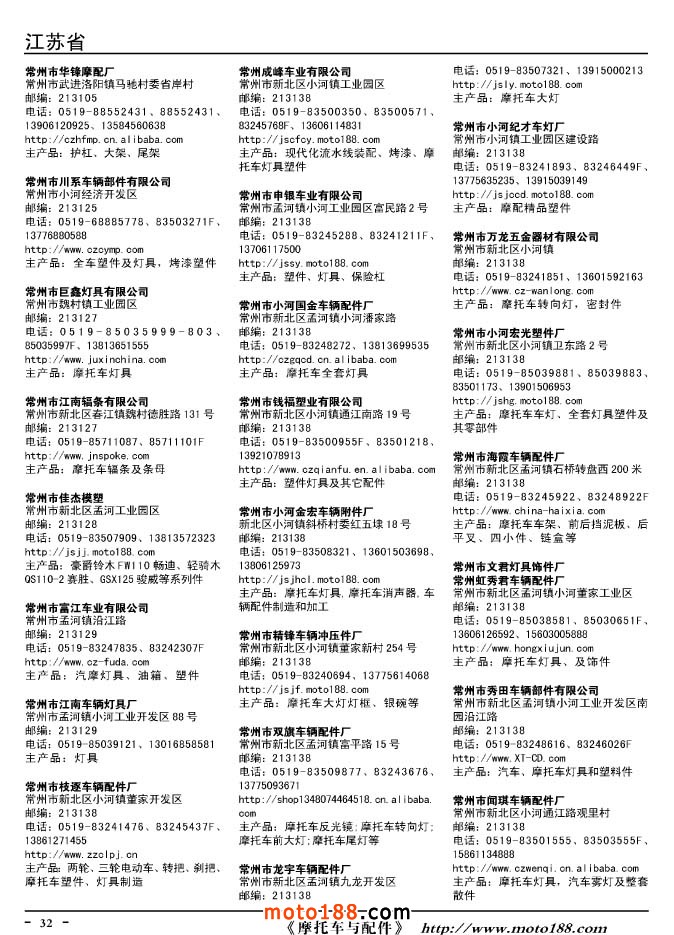 這兩年行業(yè)調(diào)整力度非常大,為了確保我們提供的信息準(zhǔn)確性,我們本著寧缺毋濫的原則,不去圖虛的數(shù)量。目前摩托車與配件行業(yè)的不少經(jīng)銷商是跨行業(yè)經(jīng)營的,所以我們在本書中增加了部分摩托車整車廠、電動車生產(chǎn)廠、機動三輪車制造廠。所選的這些企業(yè)都是這個行業(yè)具有影響力的品牌企業(yè),是為了大家在使用這本書時,獲取相關(guān)的延伸產(chǎn)業(yè)更多的實用信息。