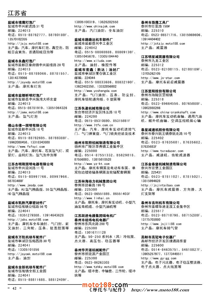 這兩年行業(yè)調(diào)整力度非常大,為了確保我們提供的信息準確性,我們本著寧缺毋濫的原則,不去圖虛的數(shù)量。目前摩托車與配件行業(yè)的不少經(jīng)銷商是跨行業(yè)經(jīng)營的,所以我們在本書中增加了部分摩托車整車廠、電動車生產(chǎn)廠、機動三輪車制造廠。所選的這些企業(yè)都是這個行業(yè)具有影響力的品牌企業(yè),是為了大家在使用這本書時,獲取相關(guān)的延伸產(chǎn)業(yè)更多的實用信息。