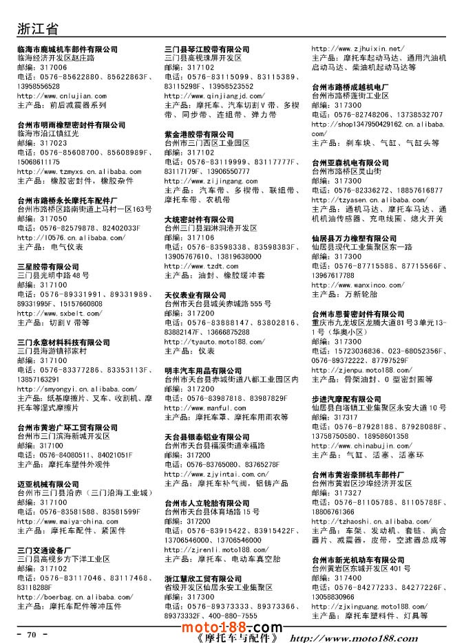 這兩年行業(yè)調(diào)整力度非常大,為了確保我們提供的信息準(zhǔn)確性,我們本著寧缺毋濫的原則,不去圖虛的數(shù)量。目前摩托車與配件行業(yè)的不少經(jīng)銷商是跨行業(yè)經(jīng)營的,所以我們在本書中增加了部分摩托車整車廠、電動車生產(chǎn)廠、機動三輪車制造廠。所選的這些企業(yè)都是這個行業(yè)具有影響力的品牌企業(yè),是為了大家在使用這本書時,獲取相關(guān)的延伸產(chǎn)業(yè)更多的實用信息。