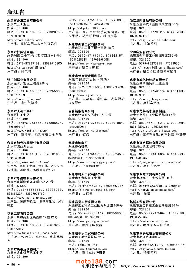 這兩年行業(yè)調整力度非常大,為了確保我們提供的信息準確性,我們本著寧缺毋濫的原則,不去圖虛的數(shù)量。目前摩托車與配件行業(yè)的不少經(jīng)銷商是跨行業(yè)經(jīng)營的,所以我們在本書中增加了部分摩托車整車廠、電動車生產(chǎn)廠、機動三輪車制造廠。所選的這些企業(yè)都是這個行業(yè)具有影響力的品牌企業(yè),是為了大家在使用這本書時,獲取相關的延伸產(chǎn)業(yè)更多的實用信息。