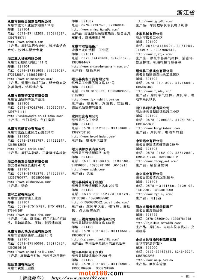 這兩年行業(yè)調(diào)整力度非常大,為了確保我們提供的信息準(zhǔn)確性,我們本著寧缺毋濫的原則,不去圖虛的數(shù)量。目前摩托車(chē)與配件行業(yè)的不少經(jīng)銷(xiāo)商是跨行業(yè)經(jīng)營(yíng)的,所以我們?cè)诒緯?shū)中增加了部分摩托車(chē)整車(chē)廠、電動(dòng)車(chē)生產(chǎn)廠、機(jī)動(dòng)三輪車(chē)制造廠。所選的這些企業(yè)都是這個(gè)行業(yè)具有影響力的品牌企業(yè),是為了大家在使用這本書(shū)時(shí),獲取相關(guān)的延伸產(chǎn)業(yè)更多的實(shí)用信息。