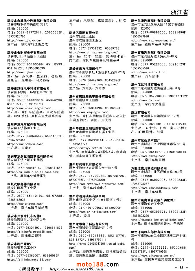 這兩年行業(yè)調(diào)整力度非常大,為了確保我們提供的信息準(zhǔn)確性,我們本著寧缺毋濫的原則,不去圖虛的數(shù)量。目前摩托車與配件行業(yè)的不少經(jīng)銷商是跨行業(yè)經(jīng)營的,所以我們在本書中增加了部分摩托車整車廠、電動車生產(chǎn)廠、機動三輪車制造廠。所選的這些企業(yè)都是這個行業(yè)具有影響力的品牌企業(yè),是為了大家在使用這本書時,獲取相關(guān)的延伸產(chǎn)業(yè)更多的實用信息。