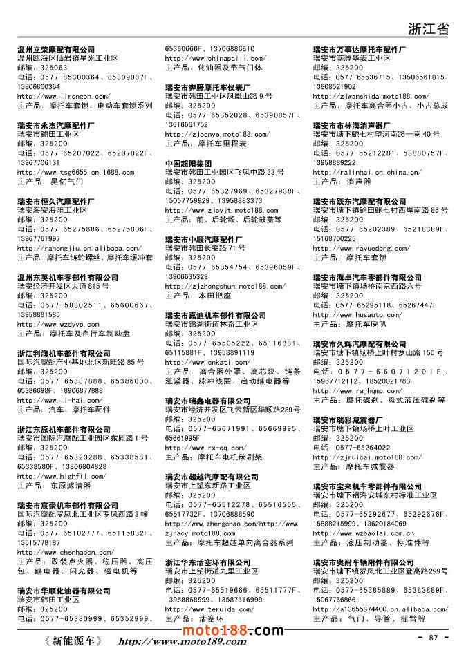 這兩年行業(yè)調(diào)整力度非常大,為了確保我們提供的信息準(zhǔn)確性,我們本著寧缺毋濫的原則,不去圖虛的數(shù)量。目前摩托車與配件行業(yè)的不少經(jīng)銷商是跨行業(yè)經(jīng)營(yíng)的,所以我們?cè)诒緯性黾恿瞬糠帜ν熊囌噺S、電動(dòng)車生產(chǎn)廠、機(jī)動(dòng)三輪車制造廠。所選的這些企業(yè)都是這個(gè)行業(yè)具有影響力的品牌企業(yè),是為了大家在使用這本書時(shí),獲取相關(guān)的延伸產(chǎn)業(yè)更多的實(shí)用信息。