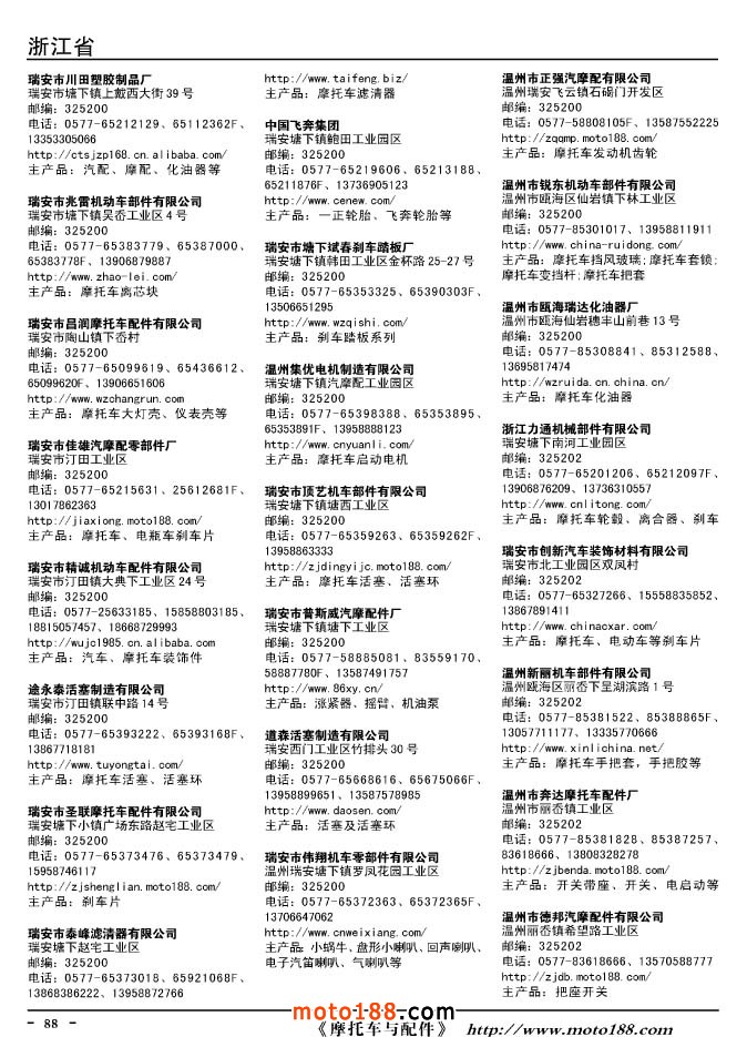 這兩年行業(yè)調(diào)整力度非常大,為了確保我們提供的信息準(zhǔn)確性,我們本著寧缺毋濫的原則,不去圖虛的數(shù)量。目前摩托車與配件行業(yè)的不少經(jīng)銷商是跨行業(yè)經(jīng)營的,所以我們在本書中增加了部分摩托車整車廠、電動車生產(chǎn)廠、機(jī)動三輪車制造廠。所選的這些企業(yè)都是這個行業(yè)具有影響力的品牌企業(yè),是為了大家在使用這本書時,獲取相關(guān)的延伸產(chǎn)業(yè)更多的實用信息。