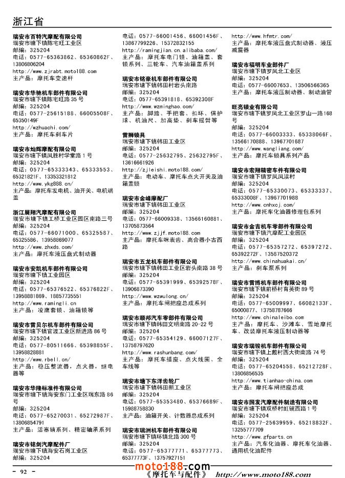 這兩年行業(yè)調(diào)整力度非常大,為了確保我們提供的信息準(zhǔn)確性,我們本著寧缺毋濫的原則,不去圖虛的數(shù)量。目前摩托車與配件行業(yè)的不少經(jīng)銷商是跨行業(yè)經(jīng)營的,所以我們在本書中增加了部分摩托車整車廠、電動(dòng)車生產(chǎn)廠、機(jī)動(dòng)三輪車制造廠。所選的這些企業(yè)都是這個(gè)行業(yè)具有影響力的品牌企業(yè),是為了大家在使用這本書時(shí),獲取相關(guān)的延伸產(chǎn)業(yè)更多的實(shí)用信息。