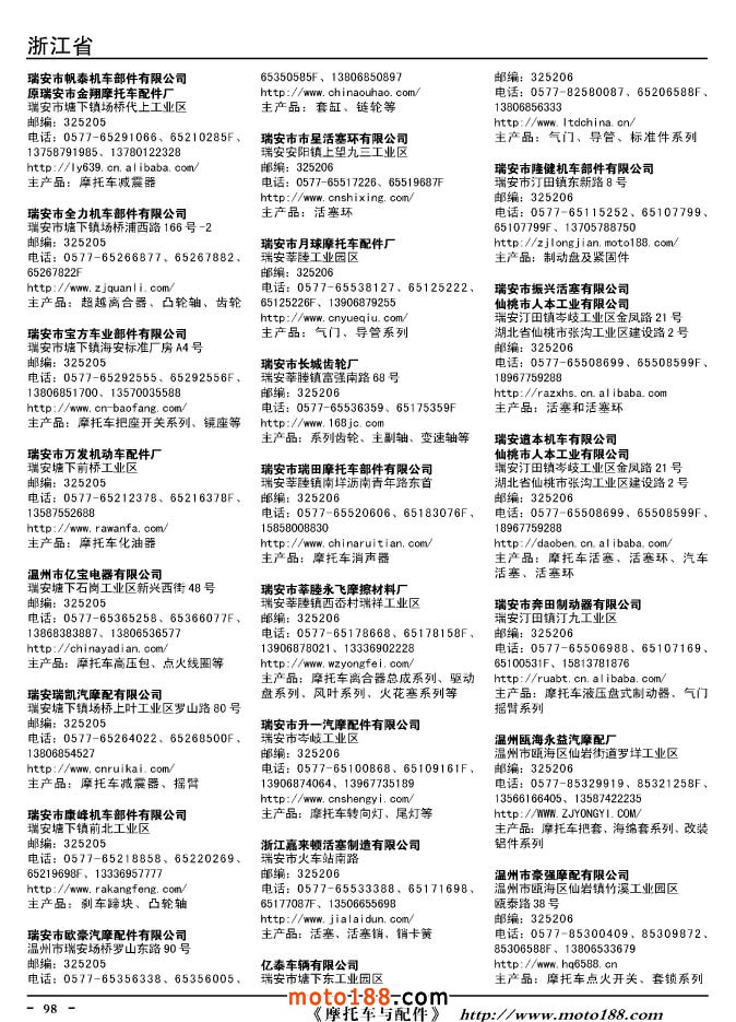 這兩年行業(yè)調(diào)整力度非常大,為了確保我們提供的信息準(zhǔn)確性,我們本著寧缺毋濫的原則,不去圖虛的數(shù)量。目前摩托車與配件行業(yè)的不少經(jīng)銷商是跨行業(yè)經(jīng)營的,所以我們在本書中增加了部分摩托車整車廠、電動車生產(chǎn)廠、機動三輪車制造廠。所選的這些企業(yè)都是這個行業(yè)具有影響力的品牌企業(yè),是為了大家在使用這本書時,獲取相關(guān)的延伸產(chǎn)業(yè)更多的實用信息。