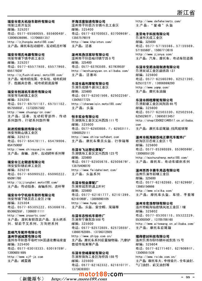 這兩年行業(yè)調整力度非常大,為了確保我們提供的信息準確性,我們本著寧缺毋濫的原則,不去圖虛的數量。目前摩托車與配件行業(yè)的不少經銷商是跨行業(yè)經營的,所以我們在本書中增加了部分摩托車整車廠、電動車生產廠、機動三輪車制造廠。所選的這些企業(yè)都是這個行業(yè)具有影響力的品牌企業(yè),是為了大家在使用這本書時,獲取相關的延伸產業(yè)更多的實用信息。
