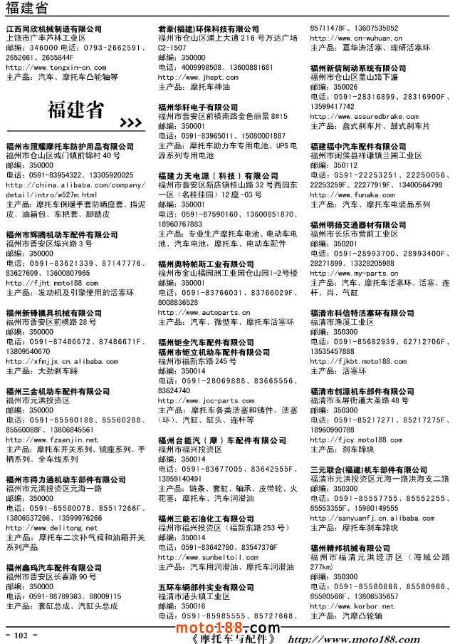 這兩年行業(yè)調(diào)整力度非常大,為了確保我們提供的信息準確性,我們本著寧缺毋濫的原則,不去圖虛的數(shù)量。目前摩托車與配件行業(yè)的不少經(jīng)銷商是跨行業(yè)經(jīng)營的,所以我們在本書中增加了部分摩托車整車廠、電動車生產(chǎn)廠、機動三輪車制造廠。所選的這些企業(yè)都是這個行業(yè)具有影響力的品牌企業(yè),是為了大家在使用這本書時,獲取相關(guān)的延伸產(chǎn)業(yè)更多的實用信息。