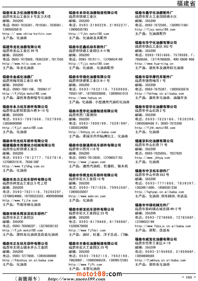 這兩年行業(yè)調整力度非常大,為了確保我們提供的信息準確性,我們本著寧缺毋濫的原則,不去圖虛的數量。目前摩托車與配件行業(yè)的不少經銷商是跨行業(yè)經營的,所以我們在本書中增加了部分摩托車整車廠、電動車生產廠、機動三輪車制造廠。所選的這些企業(yè)都是這個行業(yè)具有影響力的品牌企業(yè),是為了大家在使用這本書時,獲取相關的延伸產業(yè)更多的實用信息。
