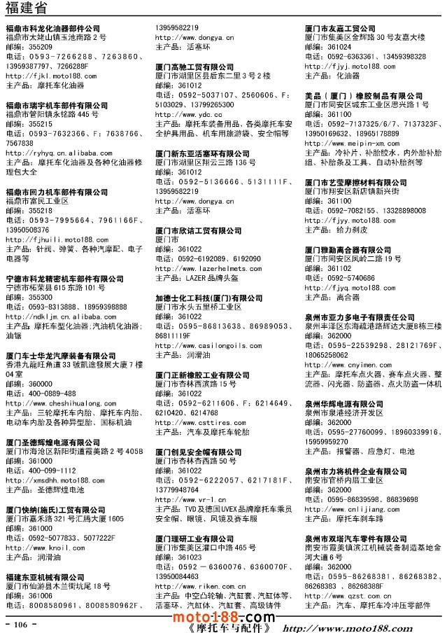 這兩年行業(yè)調(diào)整力度非常大,為了確保我們提供的信息準確性,我們本著寧缺毋濫的原則,不去圖虛的數(shù)量。目前摩托車與配件行業(yè)的不少經(jīng)銷商是跨行業(yè)經(jīng)營的,所以我們在本書中增加了部分摩托車整車廠、電動車生產(chǎn)廠、機動三輪車制造廠。所選的這些企業(yè)都是這個行業(yè)具有影響力的品牌企業(yè),是為了大家在使用這本書時,獲取相關(guān)的延伸產(chǎn)業(yè)更多的實用信息。