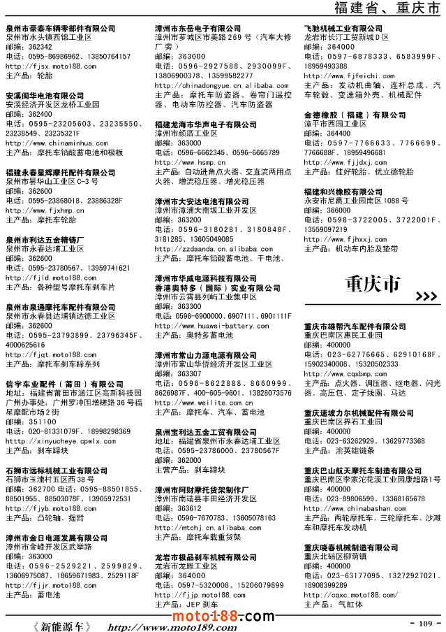 這兩年行業(yè)調(diào)整力度非常大,為了確保我們提供的信息準(zhǔn)確性,我們本著寧缺毋濫的原則,不去圖虛的數(shù)量。目前摩托車與配件行業(yè)的不少經(jīng)銷商是跨行業(yè)經(jīng)營的,所以我們在本書中增加了部分摩托車整車廠、電動(dòng)車生產(chǎn)廠、機(jī)動(dòng)三輪車制造廠。所選的這些企業(yè)都是這個(gè)行業(yè)具有影響力的品牌企業(yè),是為了大家在使用這本書時(shí),獲取相關(guān)的延伸產(chǎn)業(yè)更多的實(shí)用信息。