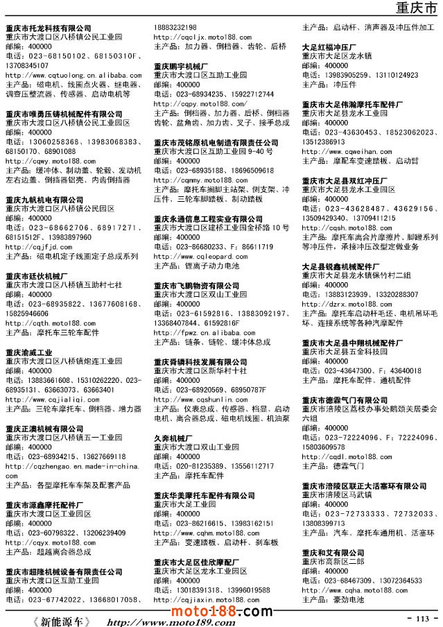 這兩年行業(yè)調(diào)整力度非常大,為了確保我們提供的信息準(zhǔn)確性,我們本著寧缺毋濫的原則,不去圖虛的數(shù)量。目前摩托車與配件行業(yè)的不少經(jīng)銷商是跨行業(yè)經(jīng)營的,所以我們?cè)诒緯性黾恿瞬糠帜ν熊囌噺S、電動(dòng)車生產(chǎn)廠、機(jī)動(dòng)三輪車制造廠。所選的這些企業(yè)都是這個(gè)行業(yè)具有影響力的品牌企業(yè),是為了大家在使用這本書時(shí),獲取相關(guān)的延伸產(chǎn)業(yè)更多的實(shí)用信息。