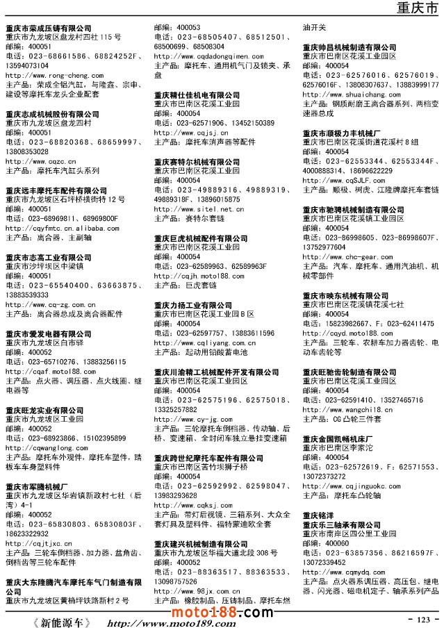 這兩年行業(yè)調(diào)整力度非常大,為了確保我們提供的信息準(zhǔn)確性,我們本著寧缺毋濫的原則,不去圖虛的數(shù)量。目前摩托車與配件行業(yè)的不少經(jīng)銷商是跨行業(yè)經(jīng)營的,所以我們?cè)诒緯性黾恿瞬糠帜ν熊囌噺S、電動(dòng)車生產(chǎn)廠、機(jī)動(dòng)三輪車制造廠。所選的這些企業(yè)都是這個(gè)行業(yè)具有影響力的品牌企業(yè),是為了大家在使用這本書時(shí),獲取相關(guān)的延伸產(chǎn)業(yè)更多的實(shí)用信息。