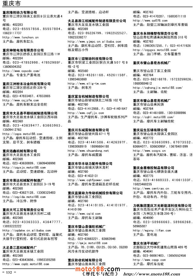2015年升級(jí)版摩托車配件生產(chǎn)企業(yè)大全對(duì)13版進(jìn)行了大力度的調(diào)整:刪除了2013年之前銷聲匿跡的單位,盡管有的電話是可以打通的,比如浙江和河北刪除的單位比較多。本次版本里的所有單位都是有具體出處和來(lái)歷的,而且是這兩年來(lái)經(jīng)營(yíng)比較活躍的單位。