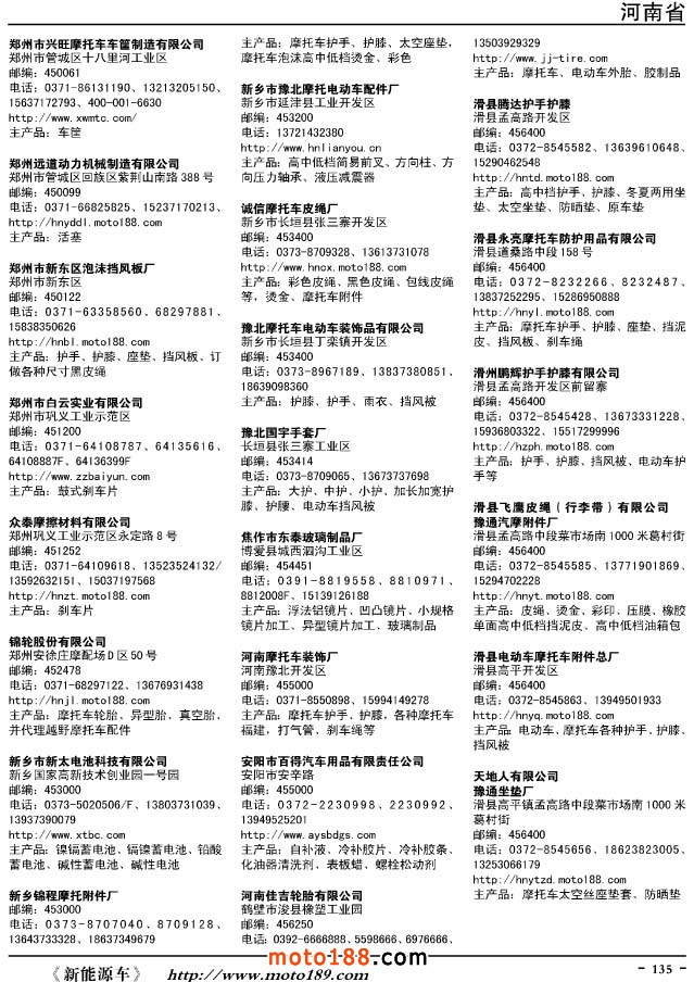 這兩年行業(yè)調(diào)整力度非常大,為了確保我們提供的信息準(zhǔn)確性,我們本著寧缺毋濫的原則,不去圖虛的數(shù)量。目前摩托車與配件行業(yè)的不少經(jīng)銷商是跨行業(yè)經(jīng)營的,所以我們在本書中增加了部分摩托車整車廠、電動車生產(chǎn)廠、機(jī)動三輪車制造廠。所選的這些企業(yè)都是這個行業(yè)具有影響力的品牌企業(yè),是為了大家在使用這本書時,獲取相關(guān)的延伸產(chǎn)業(yè)更多的實(shí)用信息。