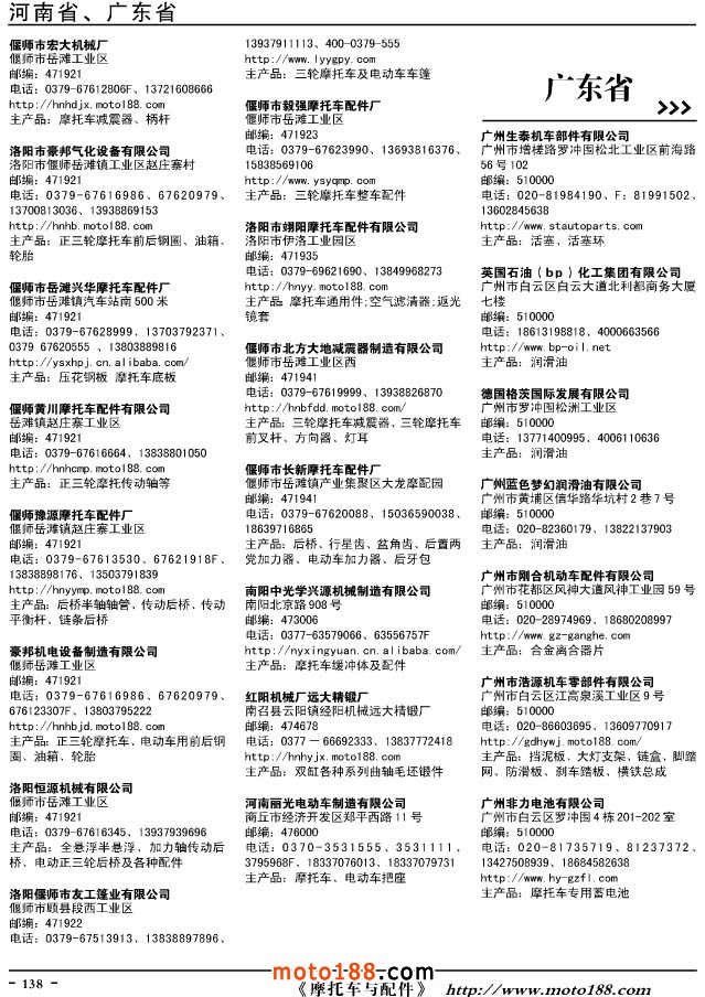 這兩年行業(yè)調(diào)整力度非常大,為了確保我們提供的信息準(zhǔn)確性,我們本著寧缺毋濫的原則,不去圖虛的數(shù)量。目前摩托車與配件行業(yè)的不少經(jīng)銷商是跨行業(yè)經(jīng)營的,所以我們在本書中增加了部分摩托車整車廠、電動(dòng)車生產(chǎn)廠、機(jī)動(dòng)三輪車制造廠。所選的這些企業(yè)都是這個(gè)行業(yè)具有影響力的品牌企業(yè),是為了大家在使用這本書時(shí),獲取相關(guān)的延伸產(chǎn)業(yè)更多的實(shí)用信息。