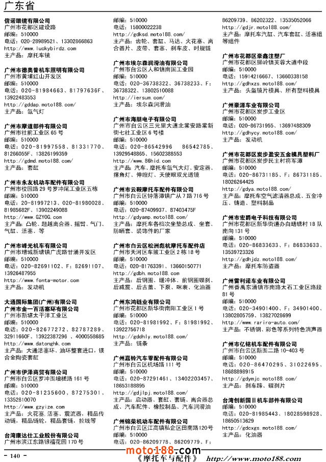這兩年行業(yè)調(diào)整力度非常大,為了確保我們提供的信息準(zhǔn)確性,我們本著寧缺毋濫的原則,不去圖虛的數(shù)量。目前摩托車(chē)與配件行業(yè)的不少經(jīng)銷(xiāo)商是跨行業(yè)經(jīng)營(yíng)的,所以我們?cè)诒緯?shū)中增加了部分摩托車(chē)整車(chē)廠、電動(dòng)車(chē)生產(chǎn)廠、機(jī)動(dòng)三輪車(chē)制造廠。所選的這些企業(yè)都是這個(gè)行業(yè)具有影響力的品牌企業(yè),是為了大家在使用這本書(shū)時(shí),獲取相關(guān)的延伸產(chǎn)業(yè)更多的實(shí)用信息。