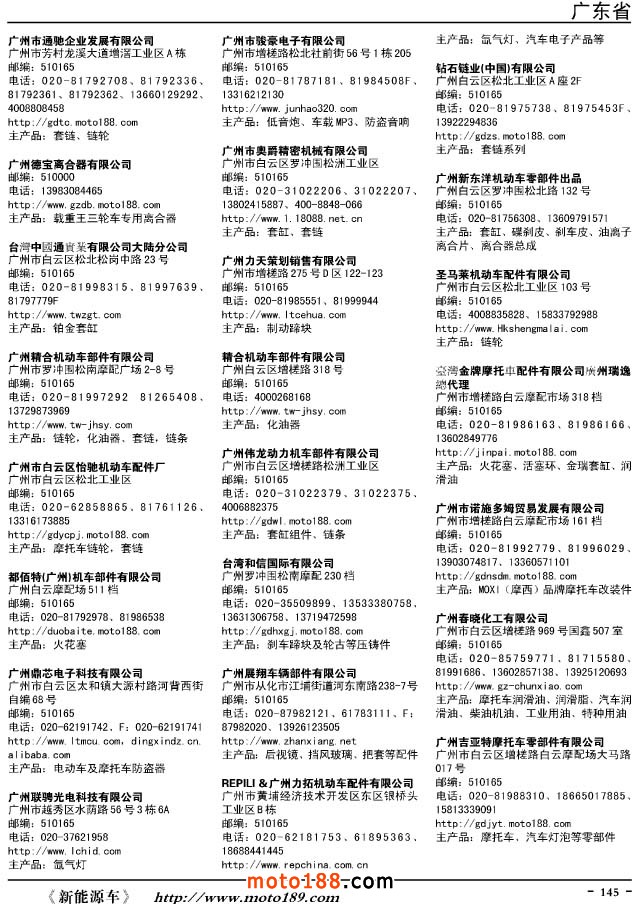 這兩年行業(yè)調(diào)整力度非常大,為了確保我們提供的信息準(zhǔn)確性,我們本著寧缺毋濫的原則,不去圖虛的數(shù)量。目前摩托車與配件行業(yè)的不少經(jīng)銷商是跨行業(yè)經(jīng)營的,所以我們在本書中增加了部分摩托車整車廠、電動(dòng)車生產(chǎn)廠、機(jī)動(dòng)三輪車制造廠。所選的這些企業(yè)都是這個(gè)行業(yè)具有影響力的品牌企業(yè),是為了大家在使用這本書時(shí),獲取相關(guān)的延伸產(chǎn)業(yè)更多的實(shí)用信息。