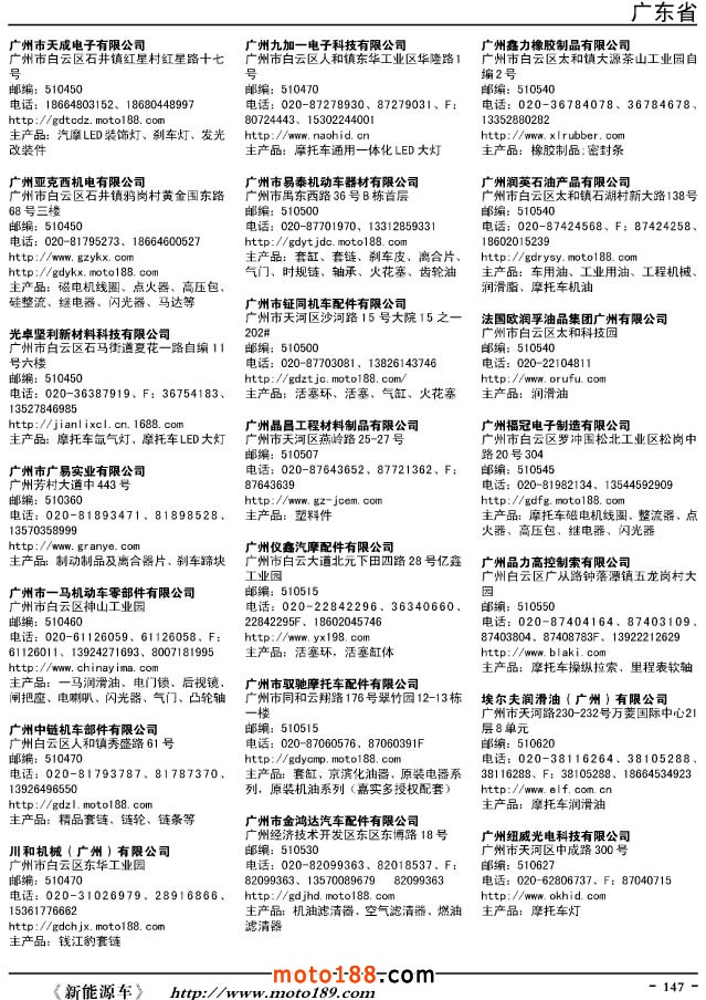 這兩年行業(yè)調(diào)整力度非常大,為了確保我們提供的信息準確性,我們本著寧缺毋濫的原則,不去圖虛的數(shù)量。目前摩托車與配件行業(yè)的不少經(jīng)銷商是跨行業(yè)經(jīng)營的,所以我們在本書中增加了部分摩托車整車廠、電動車生產(chǎn)廠、機動三輪車制造廠。所選的這些企業(yè)都是這個行業(yè)具有影響力的品牌企業(yè),是為了大家在使用這本書時,獲取相關(guān)的延伸產(chǎn)業(yè)更多的實用信息。