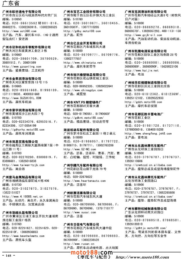 這兩年行業(yè)調(diào)整力度非常大,為了確保我們提供的信息準確性,我們本著寧缺毋濫的原則,不去圖虛的數(shù)量。目前摩托車與配件行業(yè)的不少經(jīng)銷商是跨行業(yè)經(jīng)營的,所以我們在本書中增加了部分摩托車整車廠、電動車生產(chǎn)廠、機動三輪車制造廠。所選的這些企業(yè)都是這個行業(yè)具有影響力的品牌企業(yè),是為了大家在使用這本書時,獲取相關的延伸產(chǎn)業(yè)更多的實用信息。