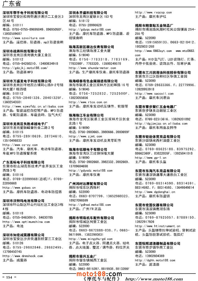 這兩年行業(yè)調(diào)整力度非常大,為了確保我們提供的信息準(zhǔn)確性,我們本著寧缺毋濫的原則,不去圖虛的數(shù)量。目前摩托車(chē)與配件行業(yè)的不少經(jīng)銷(xiāo)商是跨行業(yè)經(jīng)營(yíng)的,所以我們?cè)诒緯?shū)中增加了部分摩托車(chē)整車(chē)廠、電動(dòng)車(chē)生產(chǎn)廠、機(jī)動(dòng)三輪車(chē)制造廠。所選的這些企業(yè)都是這個(gè)行業(yè)具有影響力的品牌企業(yè),是為了大家在使用這本書(shū)時(shí),獲取相關(guān)的延伸產(chǎn)業(yè)更多的實(shí)用信息。
