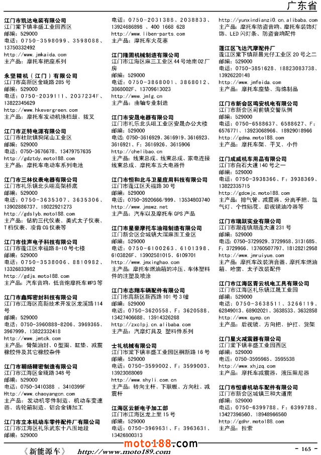 這兩年行業(yè)調(diào)整力度非常大,為了確保我們提供的信息準(zhǔn)確性,我們本著寧缺毋濫的原則,不去圖虛的數(shù)量。目前摩托車與配件行業(yè)的不少經(jīng)銷商是跨行業(yè)經(jīng)營的,所以我們?cè)诒緯性黾恿瞬糠帜ν熊囌噺S、電動(dòng)車生產(chǎn)廠、機(jī)動(dòng)三輪車制造廠。所選的這些企業(yè)都是這個(gè)行業(yè)具有影響力的品牌企業(yè),是為了大家在使用這本書時(shí),獲取相關(guān)的延伸產(chǎn)業(yè)更多的實(shí)用信息。