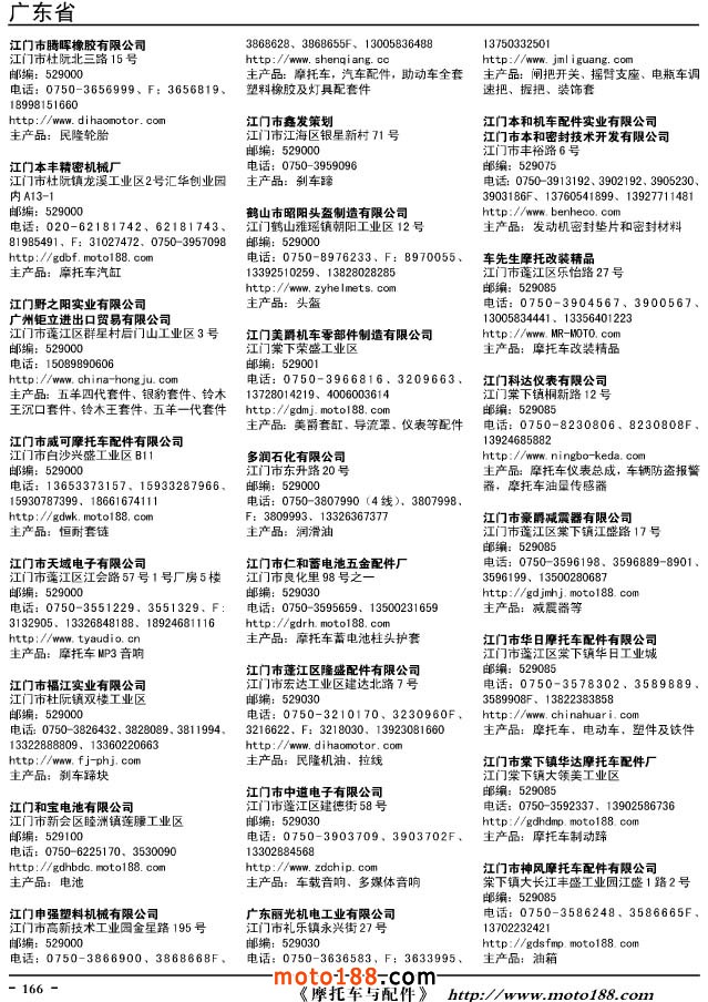 這兩年行業(yè)調(diào)整力度非常大,為了確保我們提供的信息準(zhǔn)確性,我們本著寧缺毋濫的原則,不去圖虛的數(shù)量。目前摩托車與配件行業(yè)的不少經(jīng)銷商是跨行業(yè)經(jīng)營(yíng)的,所以我們?cè)诒緯性黾恿瞬糠帜ν熊囌噺S、電動(dòng)車生產(chǎn)廠、機(jī)動(dòng)三輪車制造廠。所選的這些企業(yè)都是這個(gè)行業(yè)具有影響力的品牌企業(yè),是為了大家在使用這本書時(shí),獲取相關(guān)的延伸產(chǎn)業(yè)更多的實(shí)用信息。