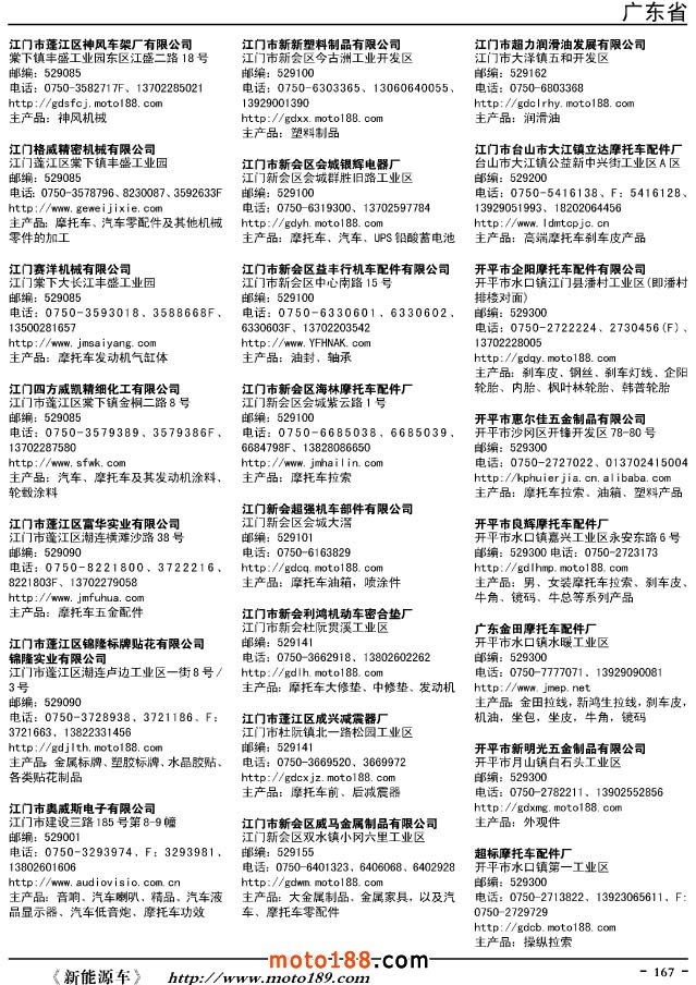 這兩年行業(yè)調(diào)整力度非常大,為了確保我們提供的信息準(zhǔn)確性,我們本著寧缺毋濫的原則,不去圖虛的數(shù)量。目前摩托車與配件行業(yè)的不少經(jīng)銷商是跨行業(yè)經(jīng)營的,所以我們?cè)诒緯性黾恿瞬糠帜ν熊囌噺S、電動(dòng)車生產(chǎn)廠、機(jī)動(dòng)三輪車制造廠。所選的這些企業(yè)都是這個(gè)行業(yè)具有影響力的品牌企業(yè),是為了大家在使用這本書時(shí),獲取相關(guān)的延伸產(chǎn)業(yè)更多的實(shí)用信息。