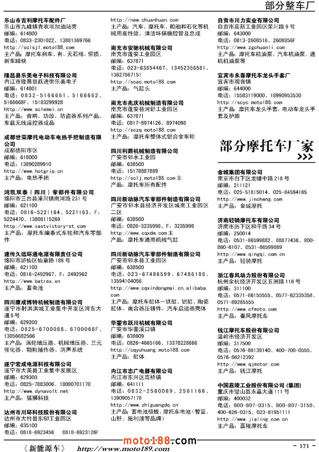 這兩年行業(yè)調(diào)整力度非常大,為了確保我們提供的信息準(zhǔn)確性,我們本著寧缺毋濫的原則,不去圖虛的數(shù)量。目前摩托車與配件行業(yè)的不少經(jīng)銷商是跨行業(yè)經(jīng)營的,所以我們?cè)诒緯性黾恿瞬糠帜ν熊囌噺S、電動(dòng)車生產(chǎn)廠、機(jī)動(dòng)三輪車制造廠。所選的這些企業(yè)都是這個(gè)行業(yè)具有影響力的品牌企業(yè),是為了大家在使用這本書時(shí),獲取相關(guān)的延伸產(chǎn)業(yè)更多的實(shí)用信息。